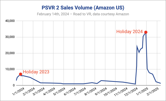 Predictably, the sale increased the sales volume of the headset, but by even more than one might have expected. PSVR 2 saw nearly five times the peak sales volume on Amazon US during the 2024 holiday season as it did in 2023.