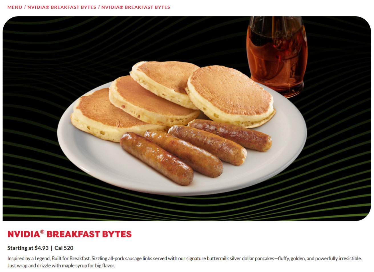Denny’s says the Nvidia Breakfast Bytes are a limited edition menu item, available until May 13. It consists of four pork sausage links, four fluffy buttermilk silver dollar pancakes, and a ladle of maple syrup.
