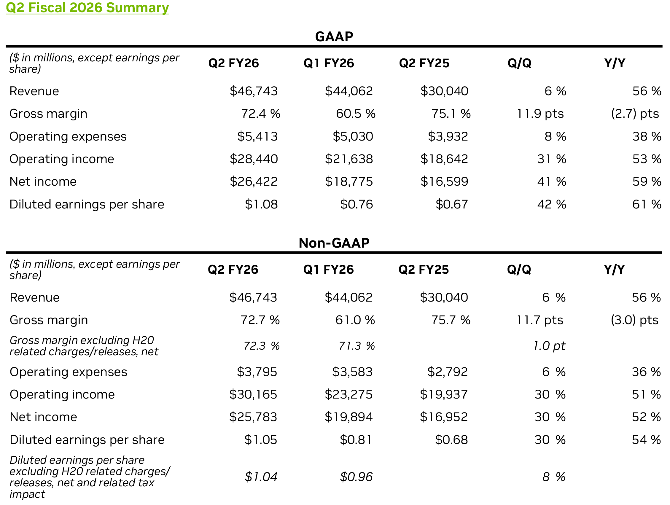 For the second quarter of fiscal year 2026, Nvidia posted GAAP revenue of $46.7 billion, up 56% year-over-year (YoY) and 6% quarter-over-quarter (QoQ). The company’s net income surged to $26.4 billion, a 59% increase from the same period last year, despite the fact that the company’s gross margin dropped 72.4% from 75.1% a year ago, to some degree due to a $180 million charge related to banned sales of its H20 AI accelerators to Chinese entities. However, Nvidia’s gross margin increased sharply from 60.5% in the prior quarter.