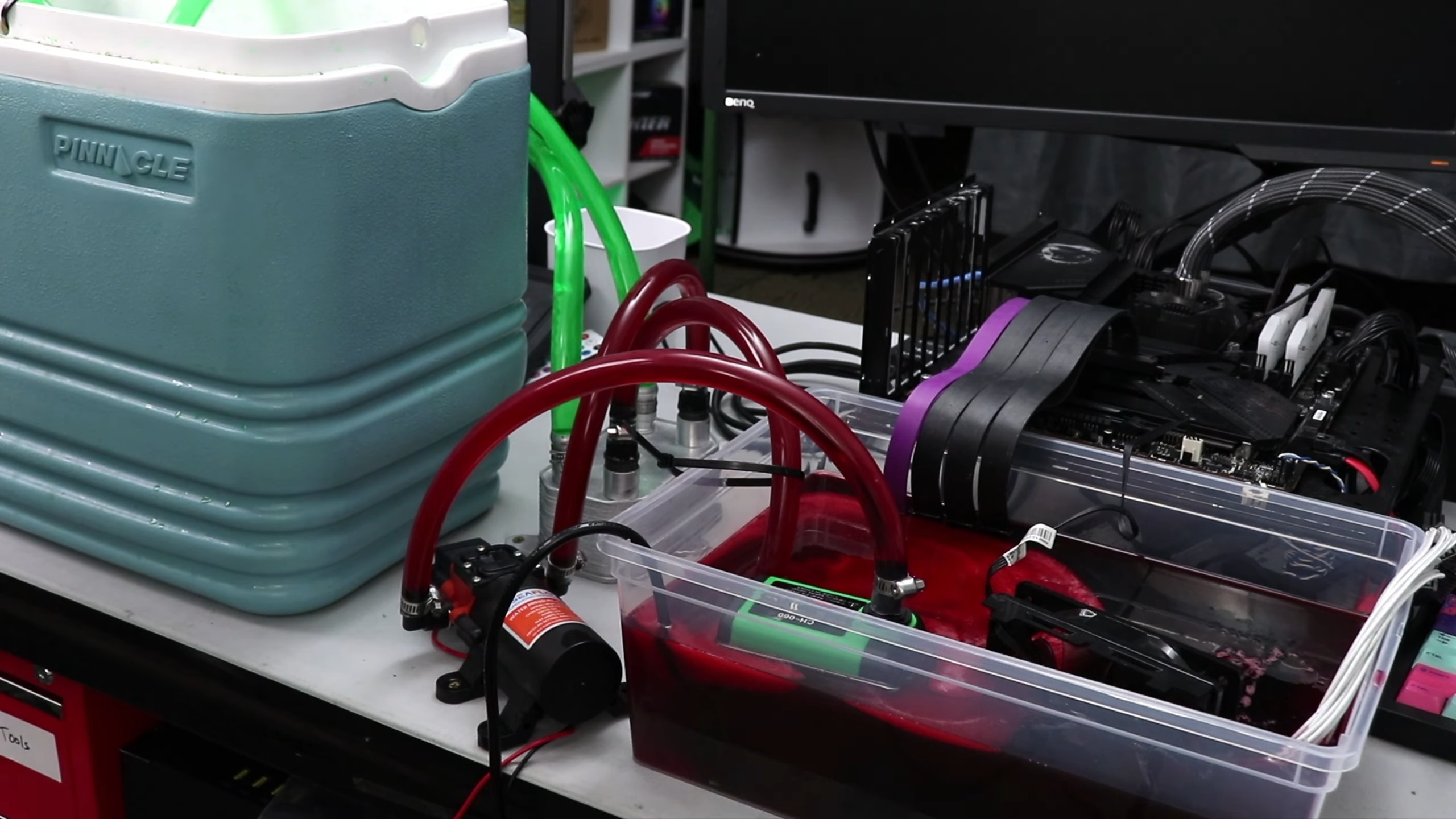 The cooling works remarkably simply. The host took a large plastic container in which he put a ROG Strix GTX 1060 stripped down to its PCB and heatsink, connected via a PCIe riser cable to a clean motherboard outside. He poured 2.1 gallons of ATF on top of it, filling the tub about halfway through. Then he installed a submersible pump inside the tub to circulate the fluid, which was connected to an external pump that facilitated the exchange of hot ATF for cold. That was the first loop.